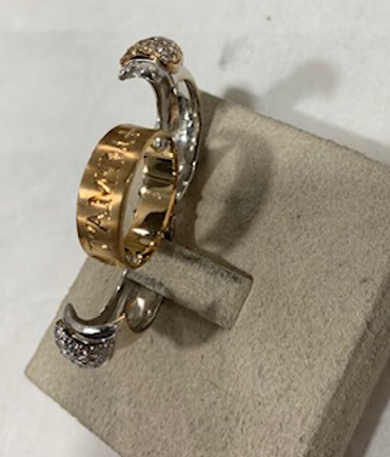 anello da donna realizzato in oro 18 carati di colore bianco e giallo con due cuori tempestati di diamanti , aprendolo c'è una fascia con la scritta "ti amo di +"
