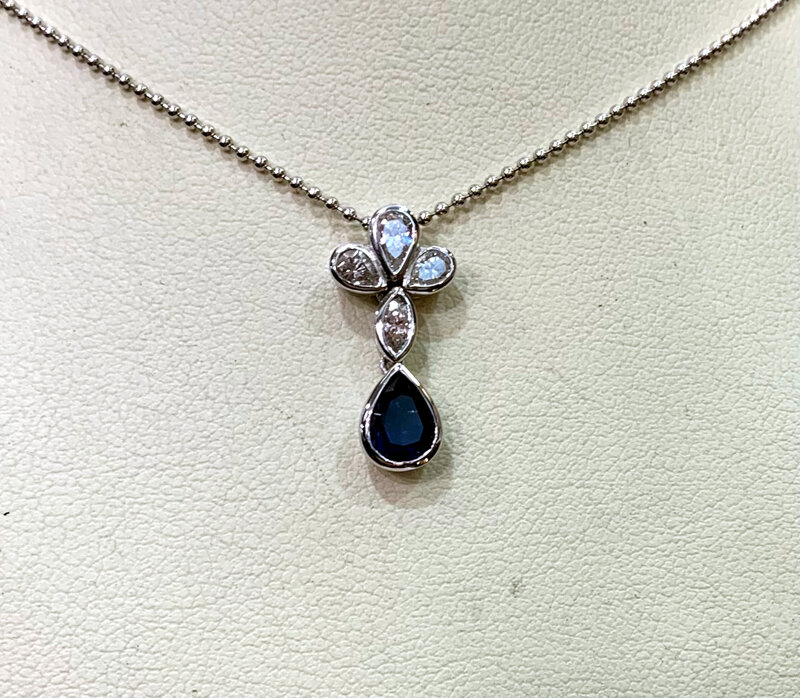 collana con pendente realizzato in oro bianco 18 ct con goccia di zaffiro naturale e diamanti taglio navette